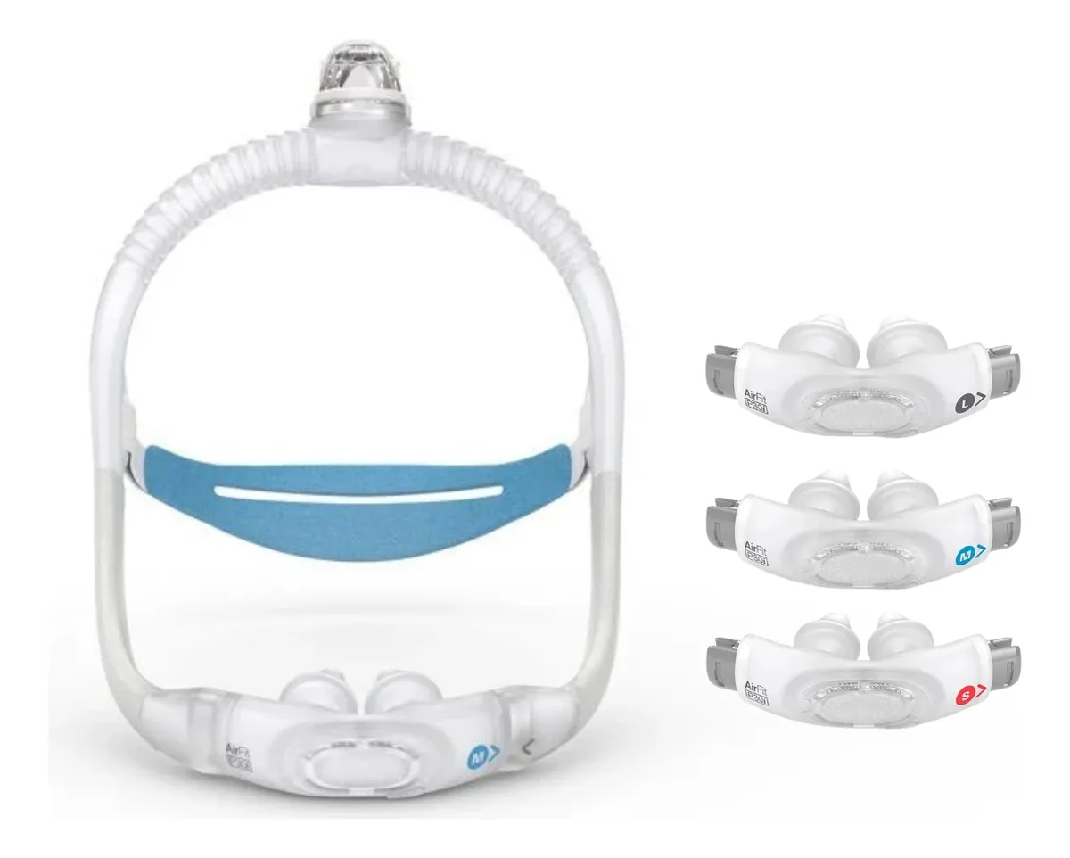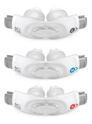A AirFit P30i é uma máscara nasal ResMed que acompanha na embalagem três almofadas de tamanhos diferentes, sendo um pequeno (S), médio (M) e grande (L). Assim, você pode experimentar e usar o tamanho que melhor adequar ao formato das narinas.